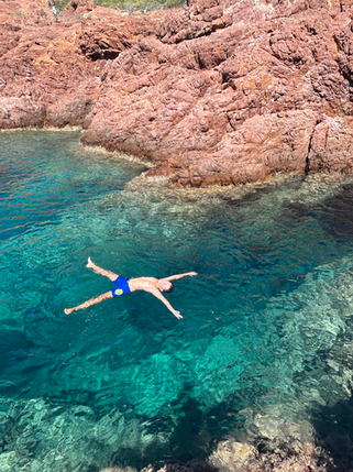Pour rejoindre d'une baignade à l'autre, il va falloir parfois nager, mais aussi marcher à même la roche de l'Estérel.